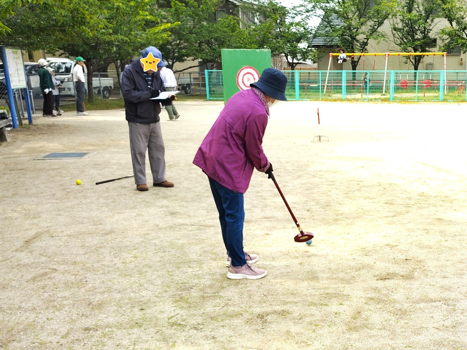 過去には何度もグラウンドゴルフ大会を見させていただいていますが、実は大会への参加は初めてで、思うようにボールが転がってくれません。老人クラブのメンバーの皆さんは、週に2回ほどの練習を重ねており、コースも熟知されています。そのため、どんどんスコアが引き離されていきました。