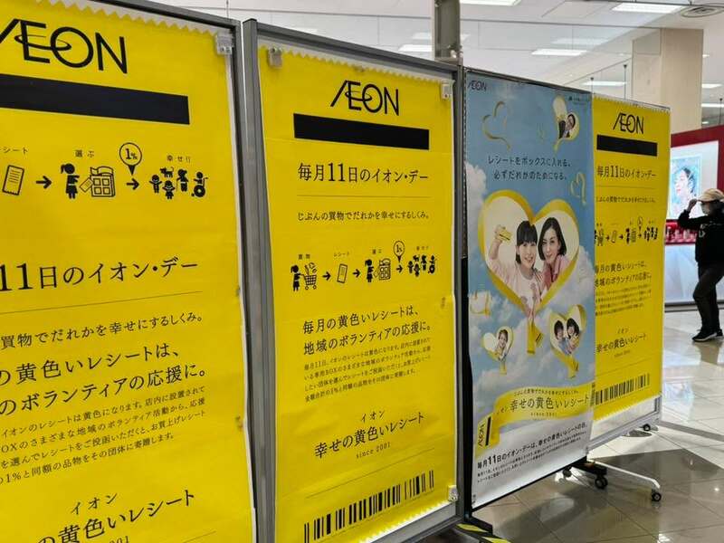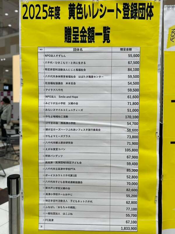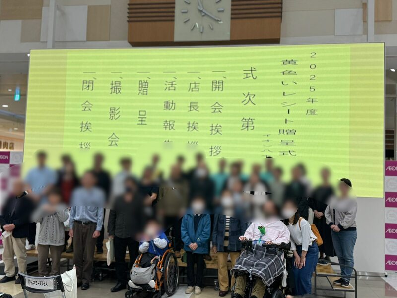 イオンの店内では、黄色いレシートの贈呈式が行われていました。各団体、毎月11日に活動した成果です。