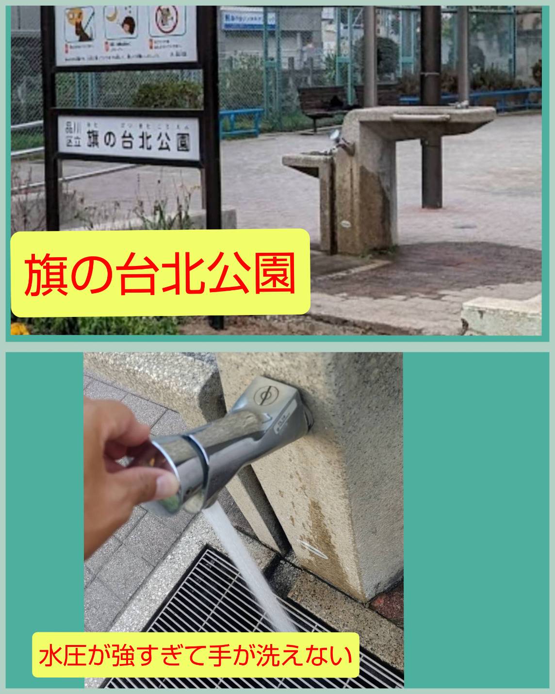 先日、地域の方々から、旗の台北公園の水道の「水圧が強すぎて、とても洗える状況じゃない」との声があり、すぐさま品川区に繋ぎ、現在では元の水がはじかない水圧になりました😀