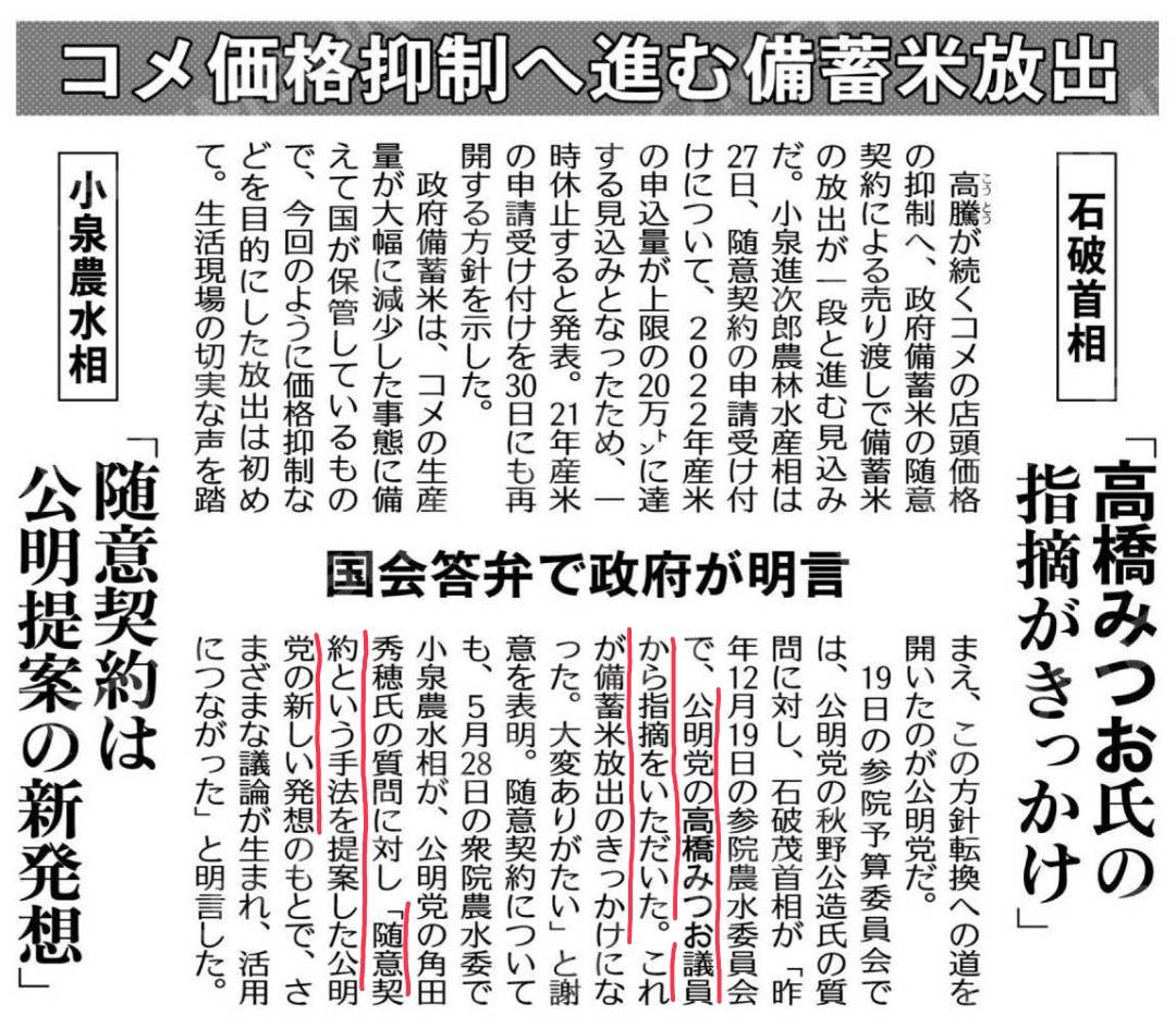 ・公明党の高橋みつお議員が、【災害時や不作以外】でも備蓄米を放出できるように求め、その法改正を実現したこと。
