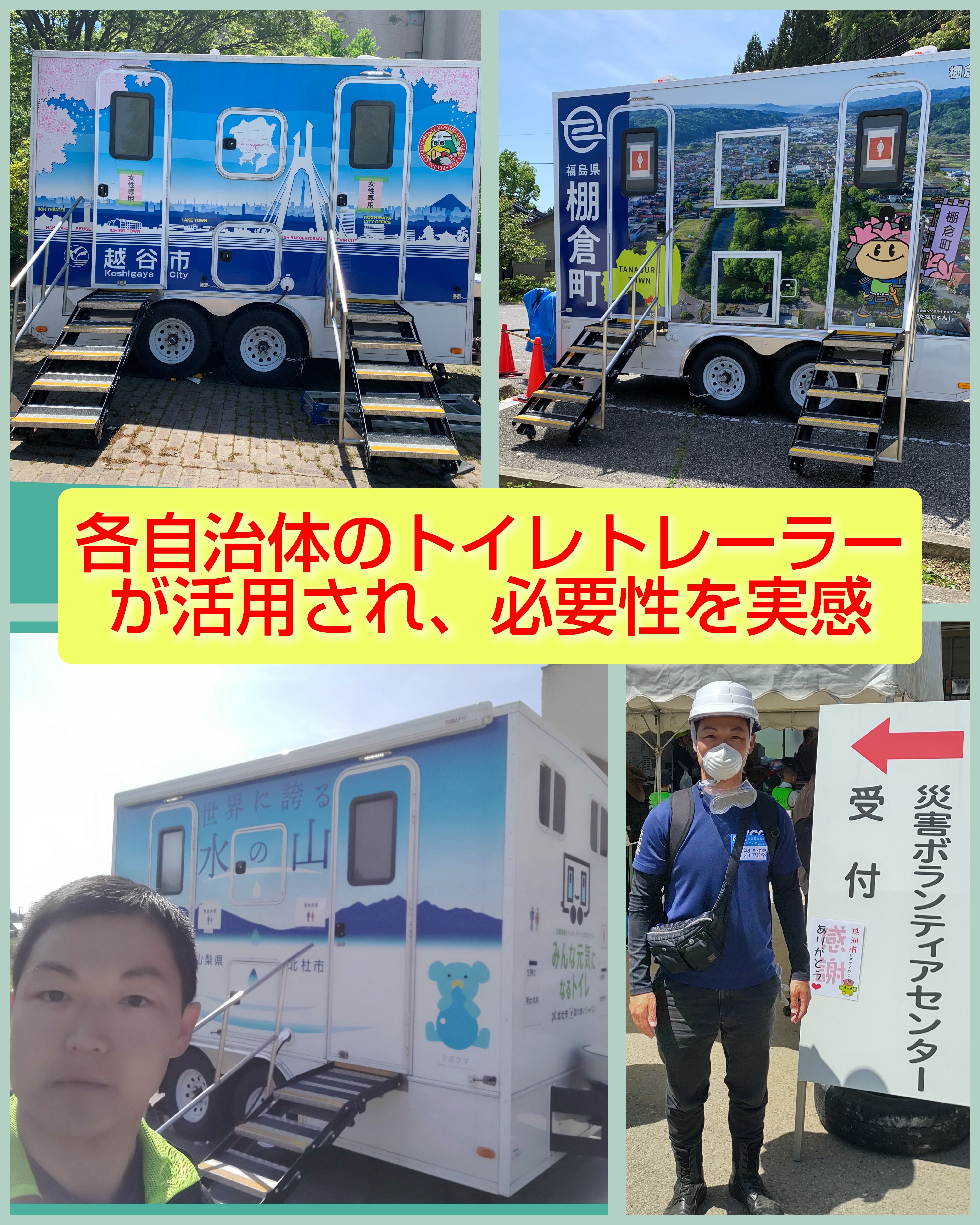各自治体から集結されたトイレトレーラーは各施設で使用され、ボランティアのメンバー、私自身も何度も活用し、トイレトレーラーは不可欠であることを実感しました。