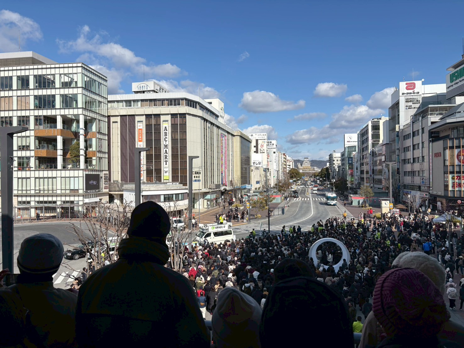 姫路駅前、北側広場にて。ものすごい聴衆となります。