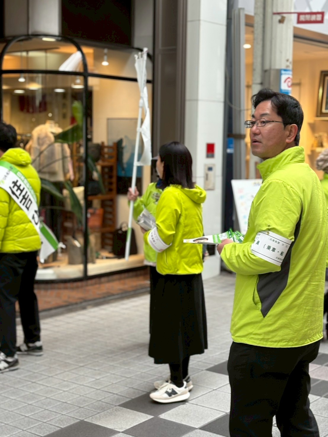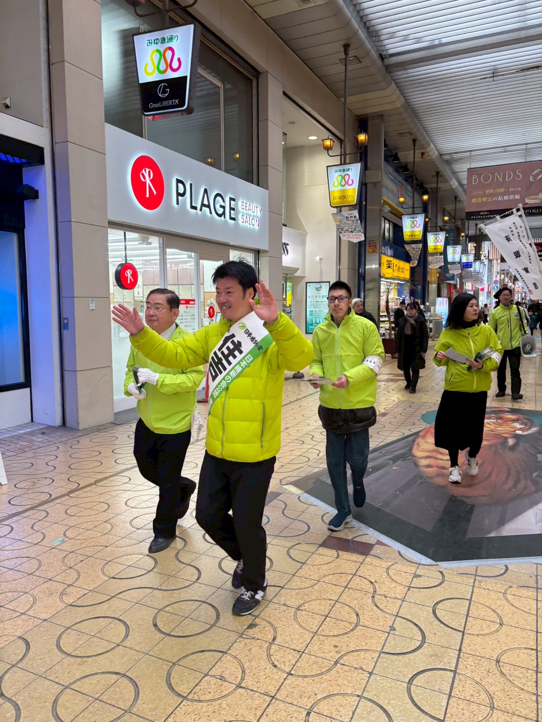 駅前での演説会の後は、みゆき通りを練り歩き。歩いている方々お一人お一人に、候補者「住吉ひろき」さんが、ご挨拶、そして握手をさせていただきました。