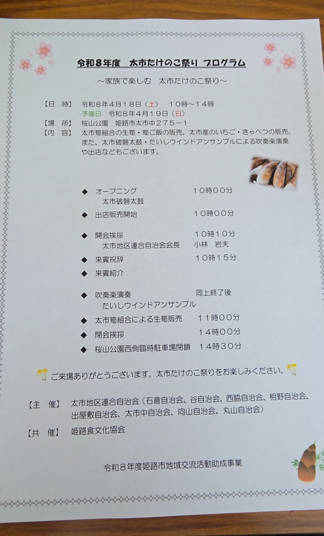 #姫路太市 #たけのこ祭り #来賓 #市議会議員 #破磐太鼓 #たいしウインドアンサンブル #竹灯り #桜山公園 #太市筍組合による生筍やたけのこご飯の販売