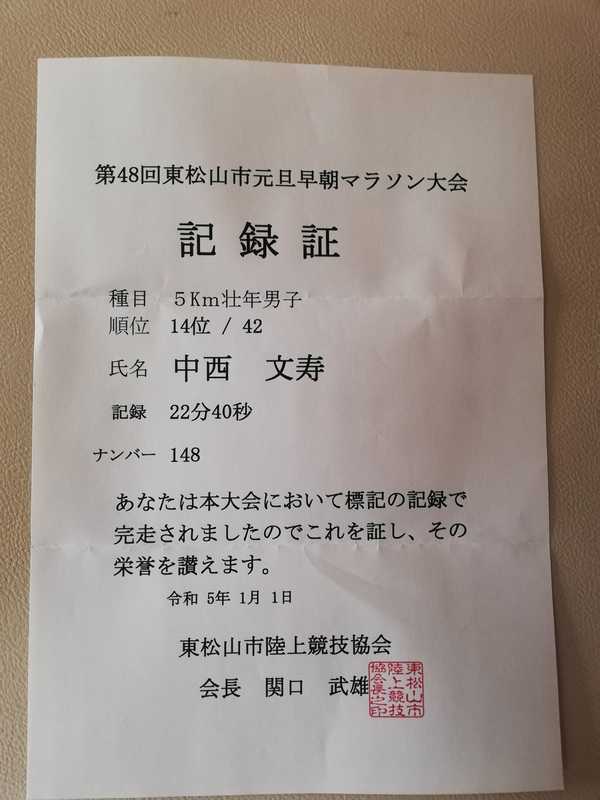 ホーム>政党・政治家>中西 ふみとし (ナカニシ フミトシ)>東松山市元旦早朝マラソン大会の記録証が届きました。