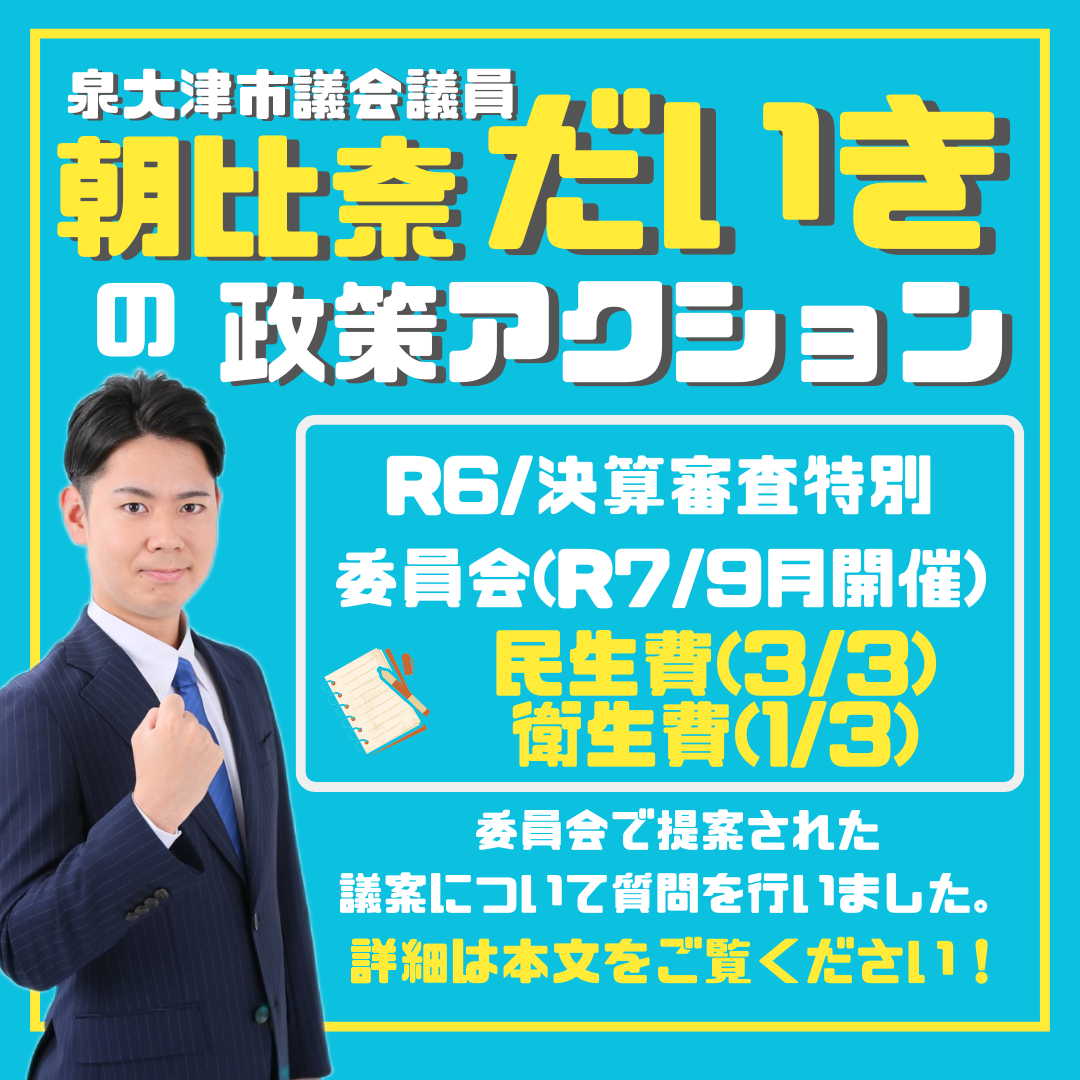 ホーム>政党・政治家>朝比奈 だいき (アサヒナ ダイキ)>【泉大津市議会議員】令和6年度決算審査特別委(民生費3/3・衛生費1/3)について【朝比奈だいき】