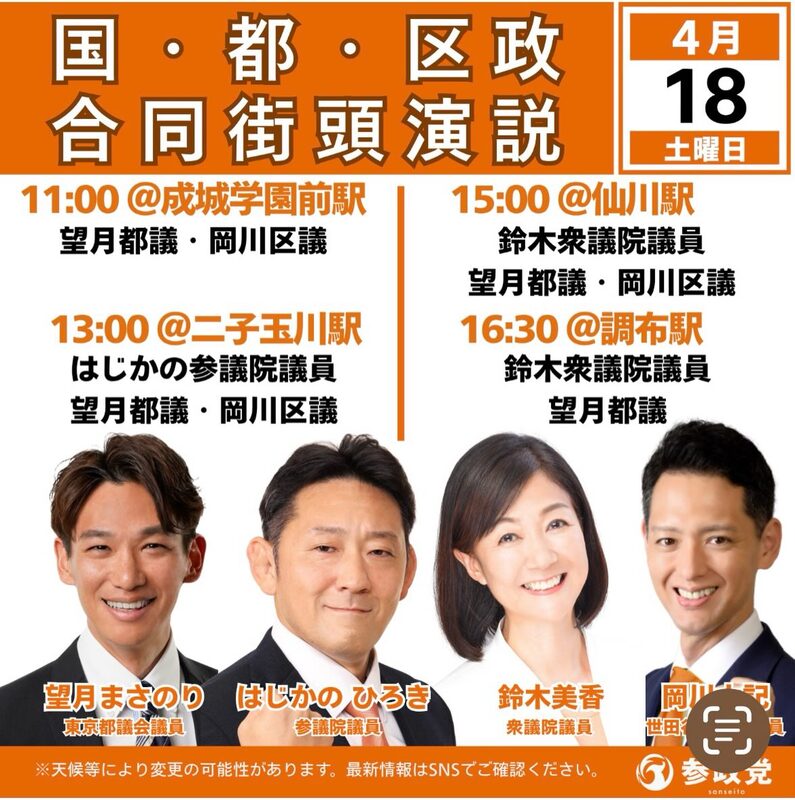 ホーム>政党・政治家>鈴木 みか (スズキ ミカ)>投稿が今になってしまいました😓本日4月18日です❣️これから仙川駅街宣です🙇♀️世田谷区→調...