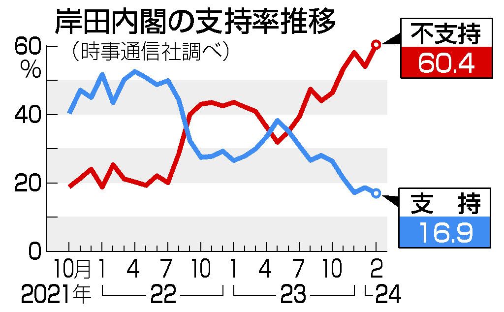 時事通信によれば、「内閣支持16.9%、最低更新 不支持初の6割台―時事世論調査」らしい。