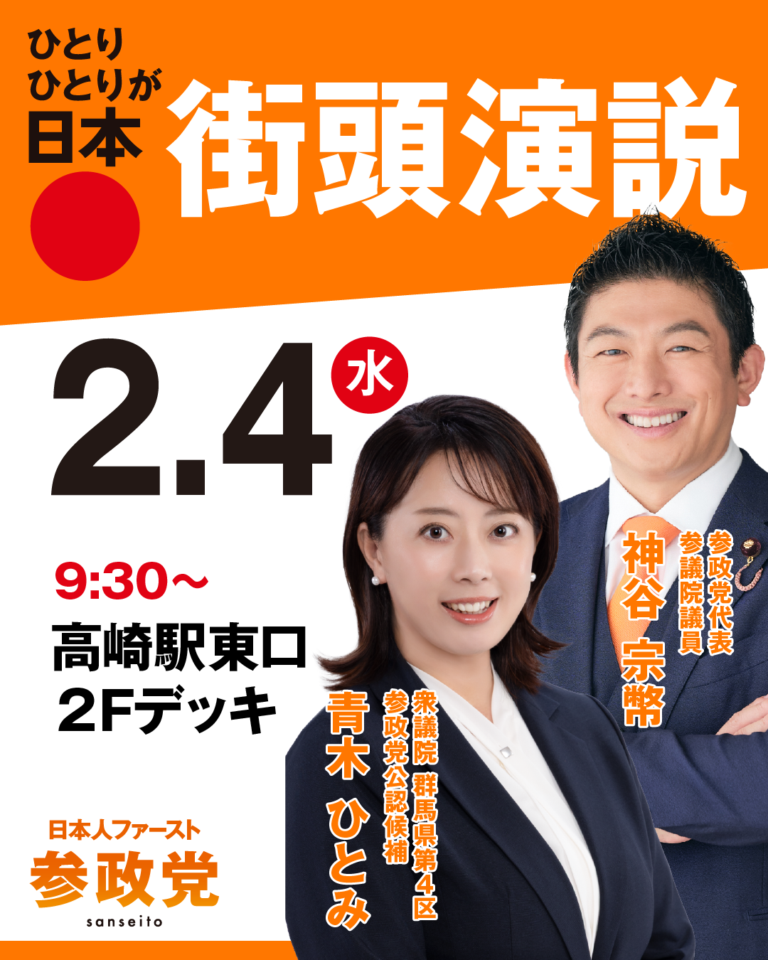 ホーム>政党・政治家>にとう すぐる (ニトウ スグル)>【神谷代表が高崎に来る!】街頭演説のお知らせ!