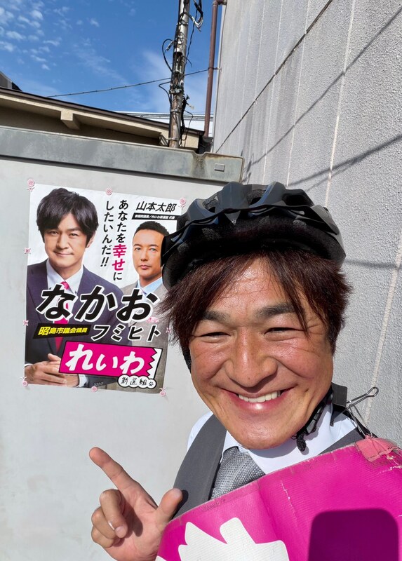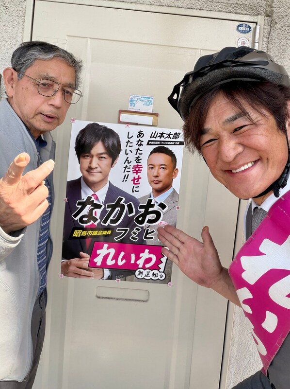 ホーム>政党・政治家>なかお フミヒト (ナカオ フミヒト)>今日のチャリ🚲活動ポスター2枚貼らせていただきました🙋♂️1枚はれいわ支持者のiさんがマンシ...