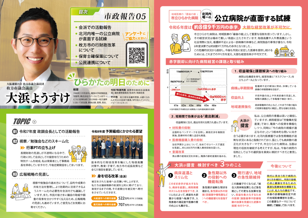 次回の市政報告チラシでは行財政改革の具体策なども含めて今後も発信を強化していきます。