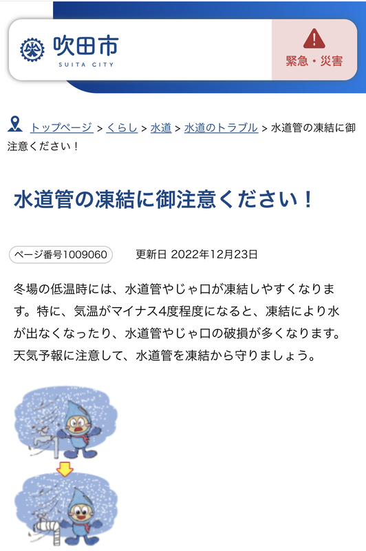 また、強い冷え込みにより、水道管の凍結・破損の恐れがあります。