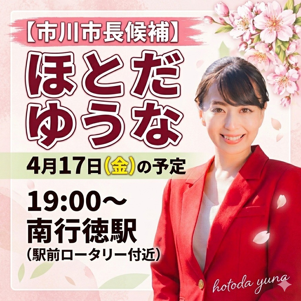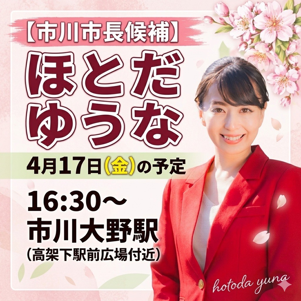 ホーム>政党・政治家>ほとだ ゆうな (ホトダ ユウナ)>◆市川市長選挙 ほとだゆうな 本日これからの予定