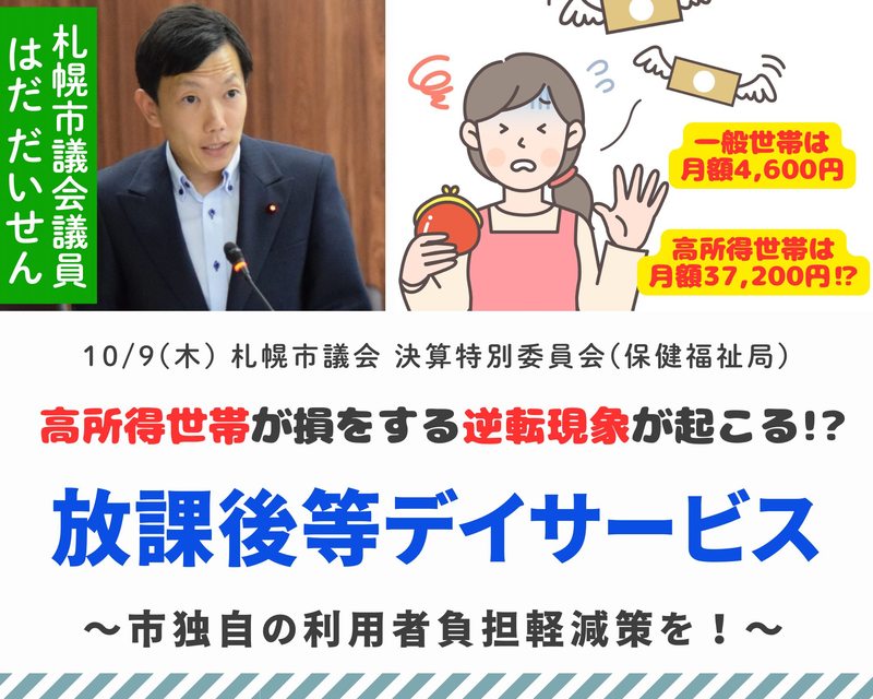 10/9(木)、札幌市議会 決算特別委員会(保健福祉局)で「放課後等デイサービス」の利用者負担について質問しました。