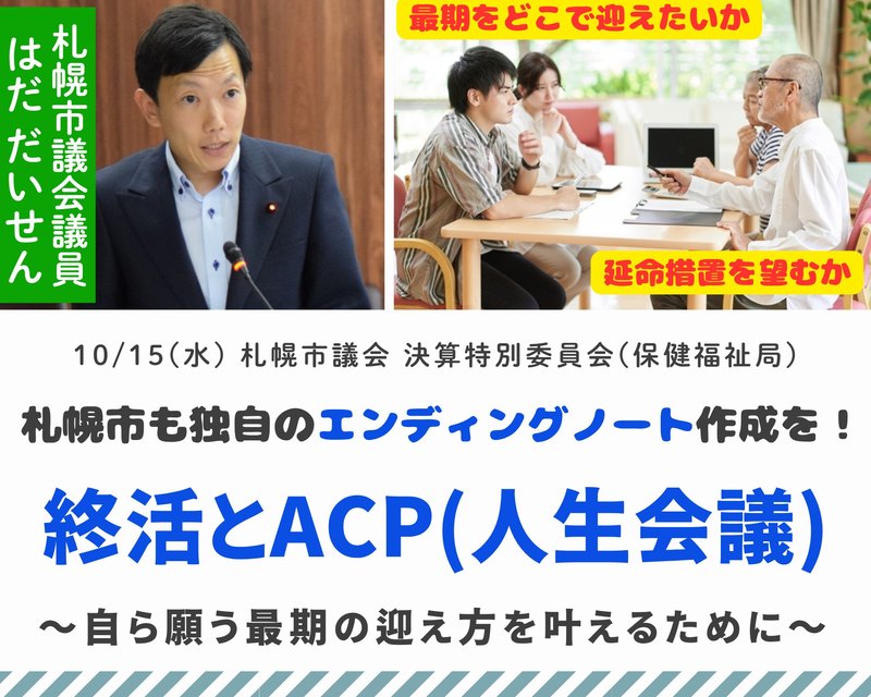10/15(水)、札幌市議会 決算特別委員会(保健福祉局)で「終活」と「ACP(人生会議)」の関わりについて質問しました。