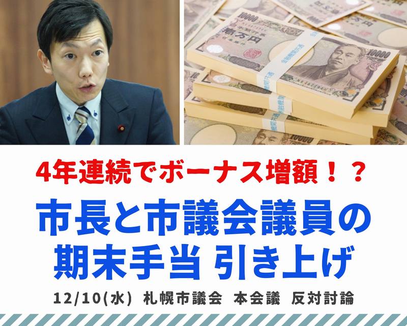ホーム>政党・政治家>はだ だいせん (ハダ ダイセン)>【4年連続でボーナス増額!?市長と市議会議員の期末手当引き上げ】12/10(水)、札幌市議会本...