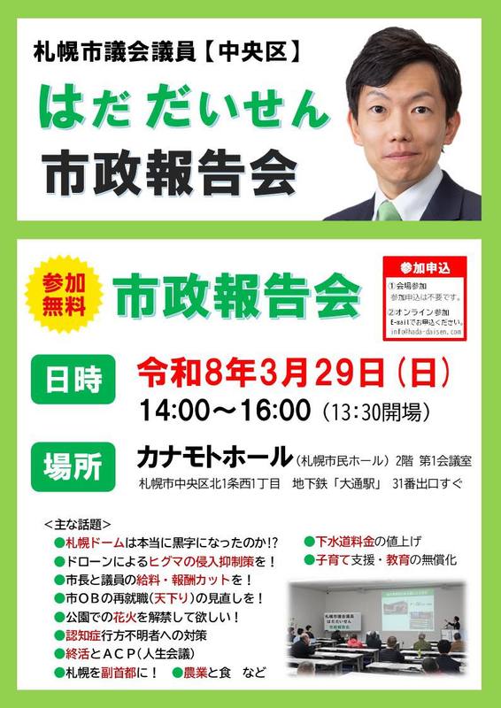 ホーム>政党・政治家>はだ だいせん (ハダ ダイセン)>【3/29(日)「市政報告会」のご案内】毎年恒例の「第3回札幌市議会議員はだだいせん市政報告会...