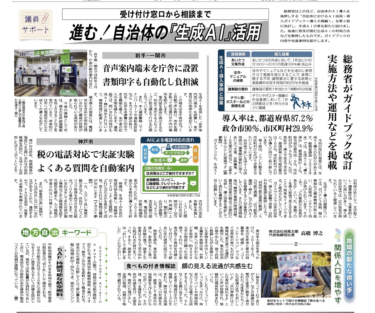 公明新聞の報道では、自治体における生成AIの活用が全国で進んでいることが紹介されていました。総務省は、自治体のAI導入を後押しするためのガイドブックを改訂し、活用事例や運用のポイントを示しています。デジタル技術を活用し、住民サービスの向上と職員の負担軽減を両立させる取り組みが広がっています。