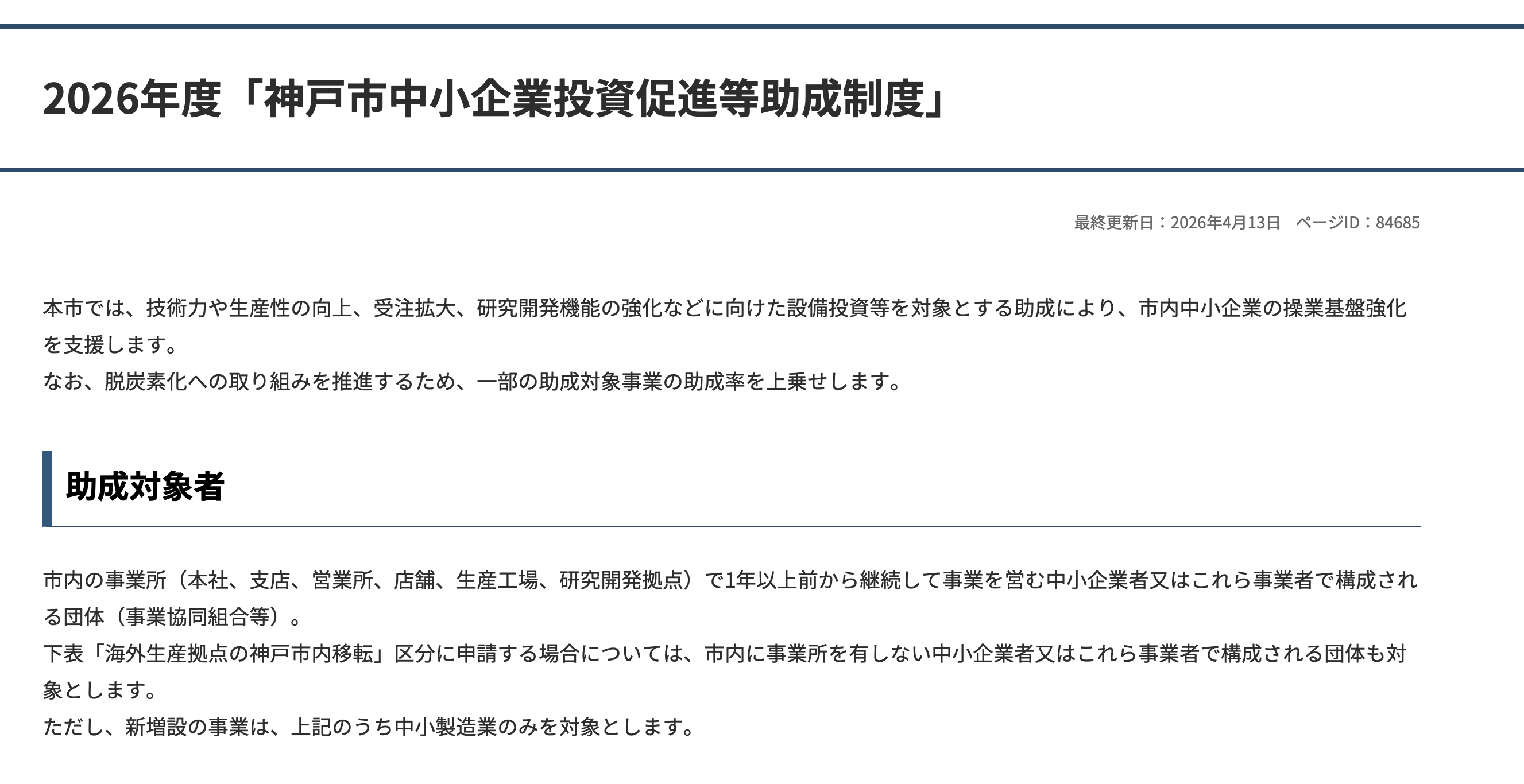 (参考:神戸市経済観光局 ものづくり産業課「2026年度 神戸市中小企業投資促進等助成制度」公募ページ)