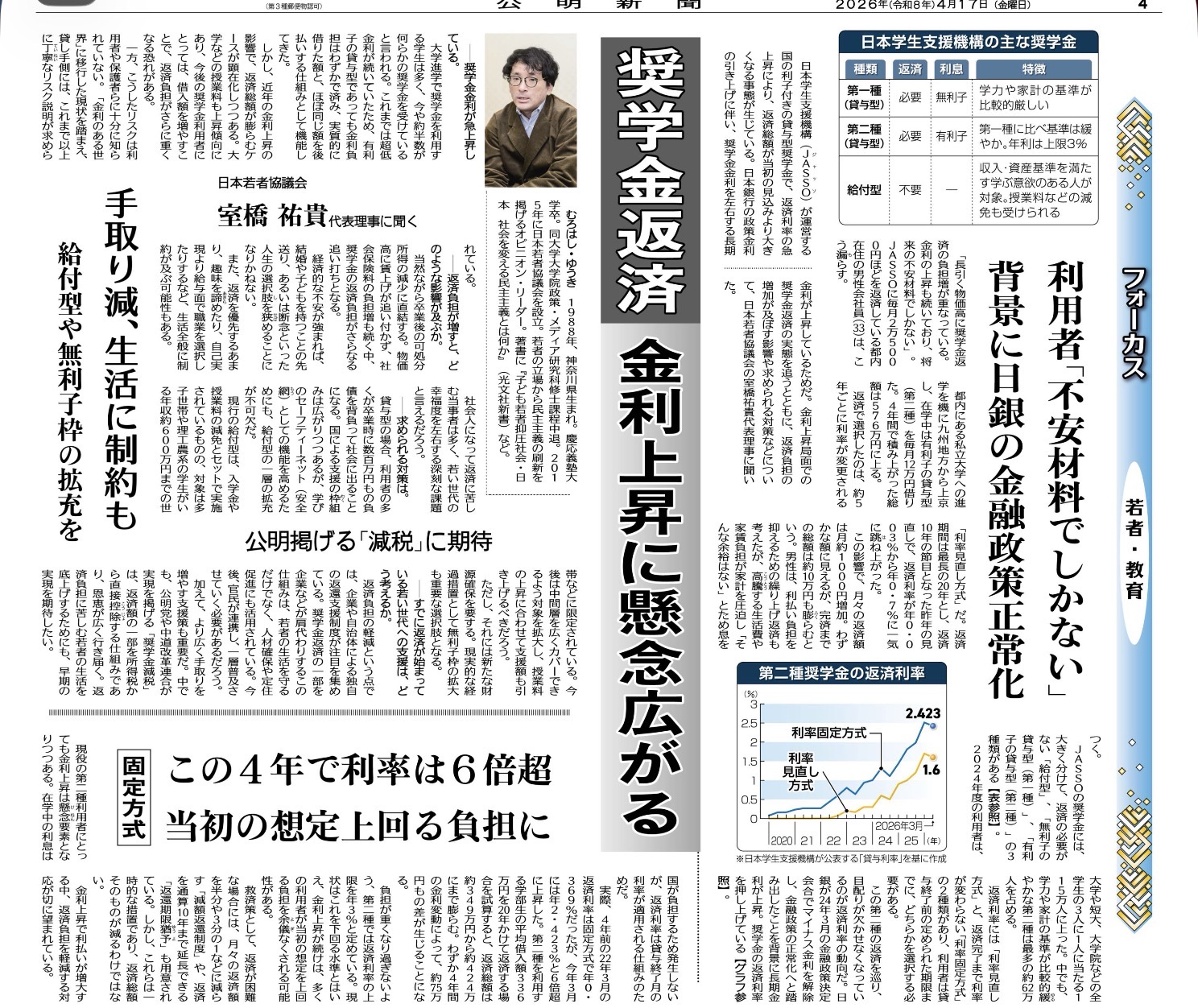 本日は(4月17日付・公明新聞)に、奨学金返済の金利上昇をめぐる記事が掲載されていました。日本学生支援機構(JASSO)の利用者は大学や短大、大学院などの全学生の3人に1人にあたる約151万人と、学びを支える大切な制度です。一方で、この4年で返済利率が6倍を超える水準まで上昇し、当初の想定を上回る負担が生じているとのことです。私たちの地元・神戸市北区にも、奨学金を返しながら働き暮らしておられる方は大勢いらっしゃいます。今日はこの記事の内容と、住民のみなさまの生活にどう関わるかを整理してお伝えします。
