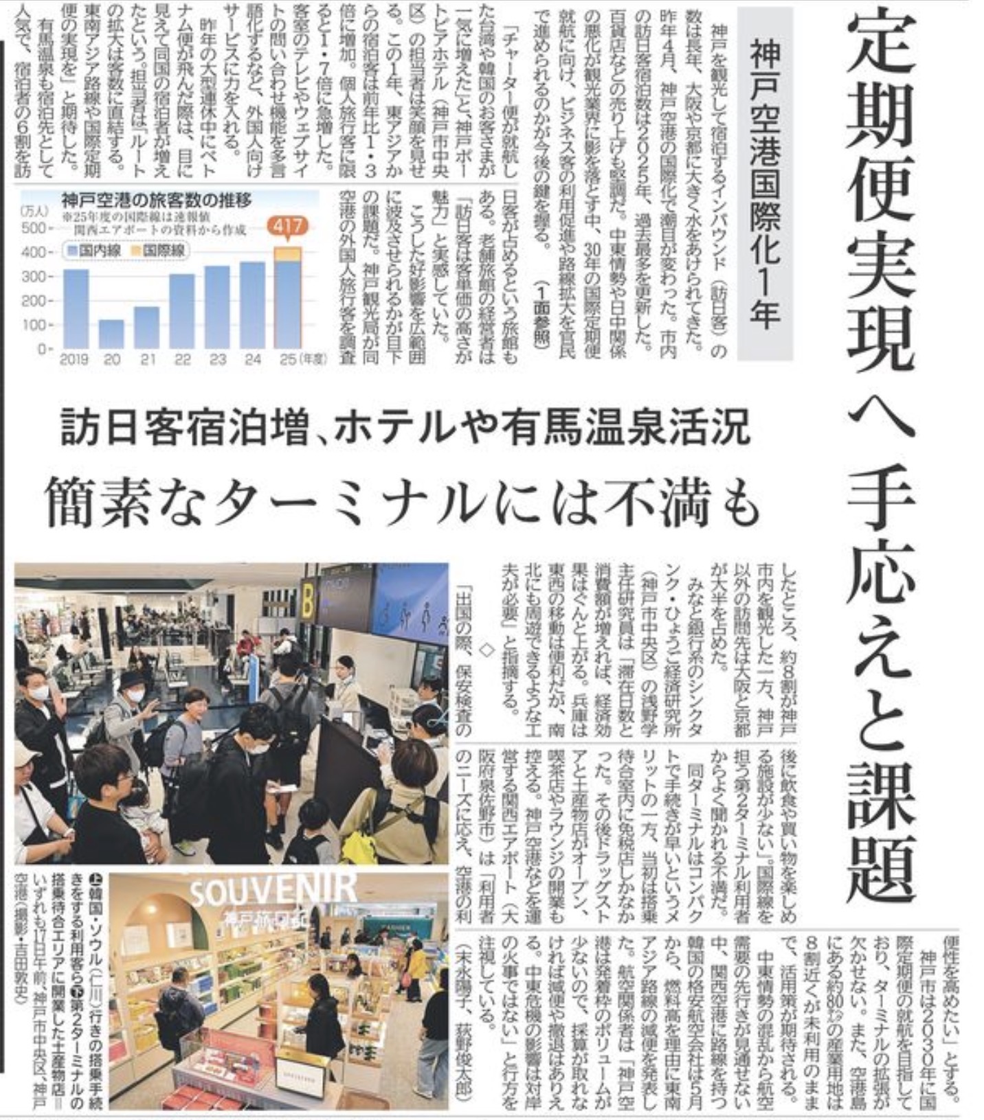 4月18日付の神戸新聞に、神戸空港の国際化1年を振り返る大きな記事が掲載されていました。見出しは「定期便実現へ手応えと課題」「訪日客宿泊増、ホテルや有馬温泉活況」「簡素なターミナルには不満も」。インバウンド(訪日客)の動きがどのように神戸のまちに波及しているのか、その実像と、これから乗り越えるべき課題が丁寧にまとめられていました。北区にも有馬温泉や観光の玄関口がありますので、私たちの地域にも直接関わる内容です。ポイントを整理してお伝えします。