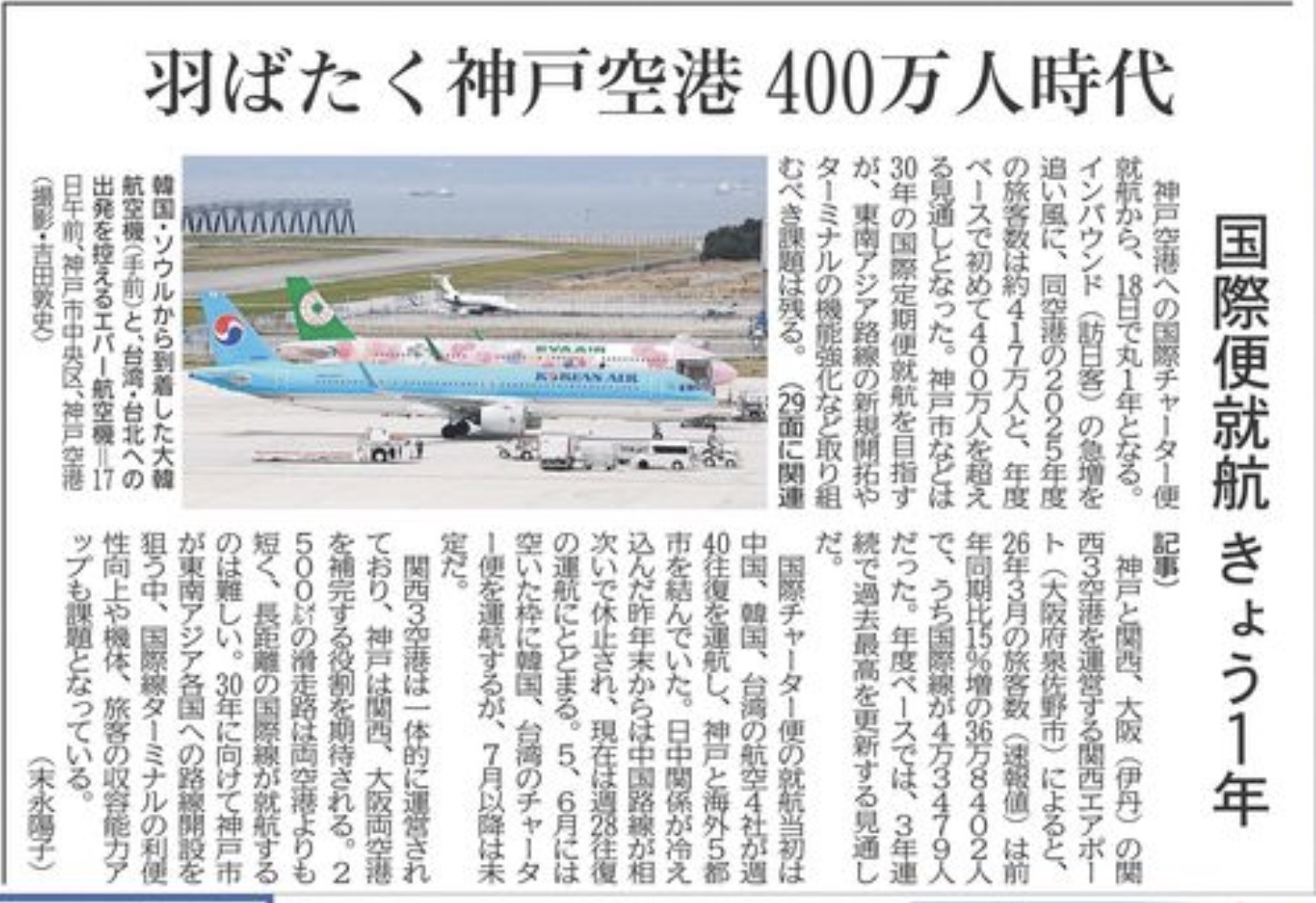4月18日付の神戸新聞に、神戸空港への国際チャーター便就航から丸1年を迎える大きな節目の記事が掲載されていました。インバウンド(訪日客)の急増を追い風に、2025年度の旅客数は約417万人と、年度ベースで初めて400万人を超える見通しとのことです。神戸空港は北区からも車や公共交通で行きやすく、出張や家族旅行、海外からお越しになるお客さまのお迎えなどで利用される方も多いと思います。今日はこの1年の歩みと、これからの課題についてお伝えします。