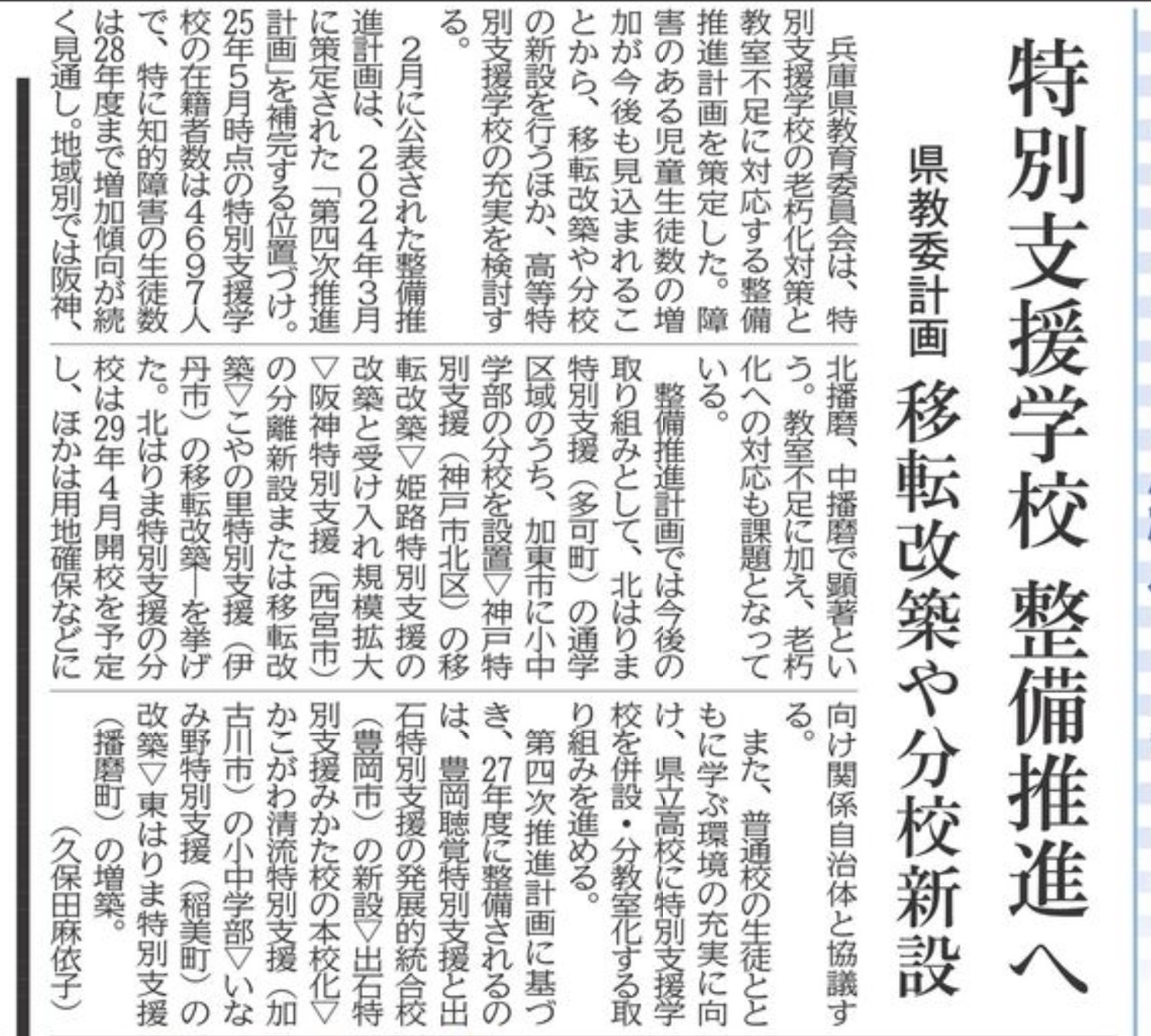 ● 在籍児童生徒の増加と、計画の中身 2月に公表された整備推進計画は、2024年3月に策定された「第四次推進計画」を補完する位置づけです。25年5月時点の特別支援学校の在籍者数は4697人。特に知的障害の生徒数は28年度まで増加傾向が続くと見込まれ、地域別では阪神、北はりま、播磨で増加が続く見通しです。具体的な取り組みとして、加東市に小中学部の分校を設置するほか、神戸特別支援(神戸市北区)の移転改築、姫路特別支援の改築と受け入れ規模拡大、阪神特別支援(西宮市)の分離新設または移転改築、こやの里特別支援(伊丹市)の移転改築、はりま特別支援みかた校の本校化などが挙げられています。北はりま特別支援の分校改築、東はりま特別支援(播磨町)の増築は29年4月開校を予定しています。