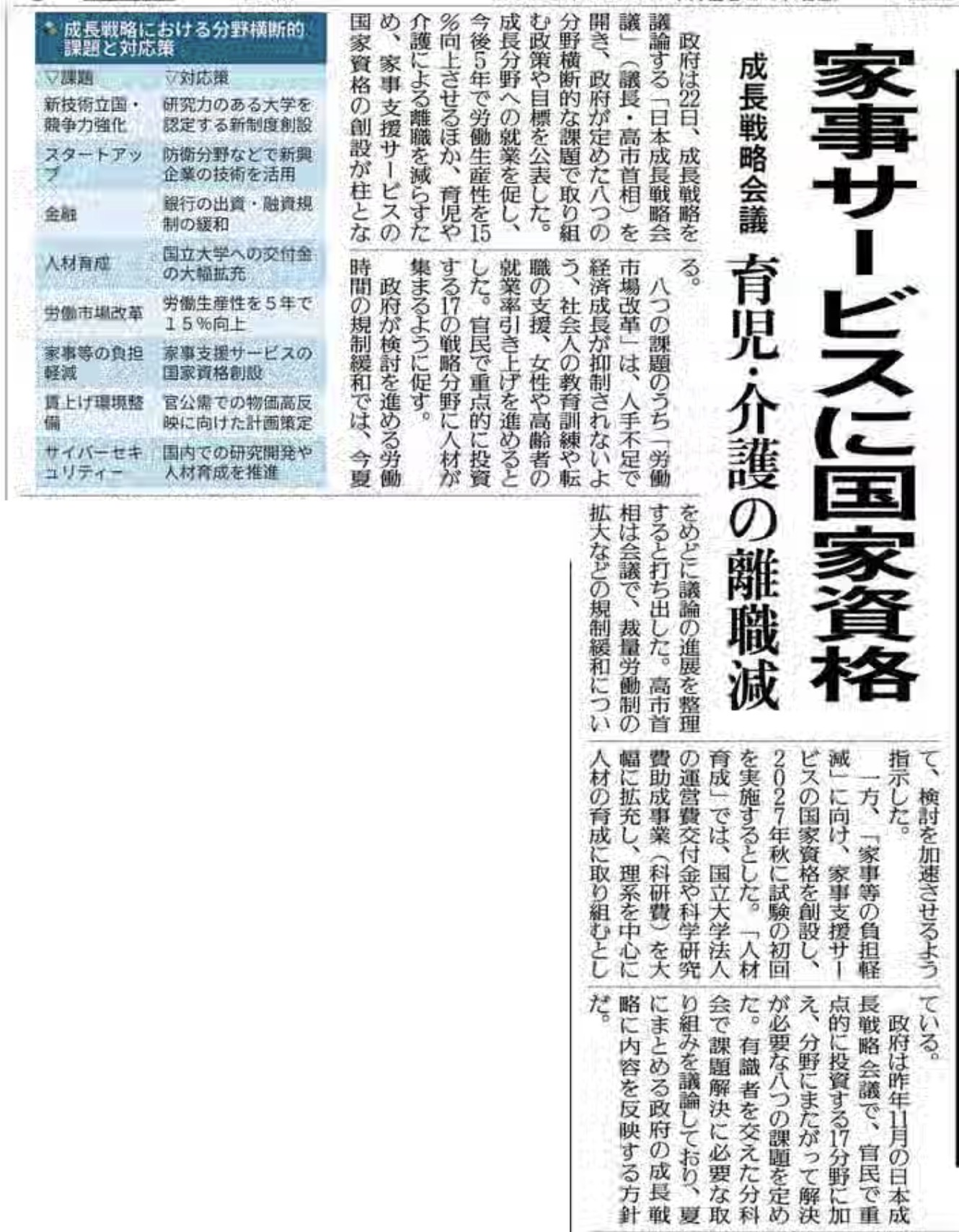 政府が22日、成長戦略会議(議長・高市首相)で、八つの経済課題と取り組む政策を公表しました。その一つとして、家事支援サービスの国家資格を創設する方針が示されており、育児や介護と仕事の両立に悩むご家庭にも関わる大切な話題です。