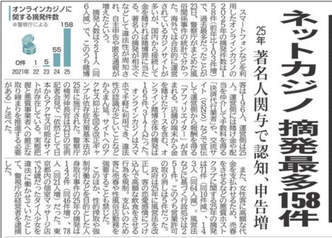 海外では合法的に運営されているカジノサイトも少なくありませんが、日本国内からこれらに接続して金銭を賭ければ、賭博罪に問われます。摘発件数は2021年の0件から、22年1件、23年5件、24年55件、そして25年は158件と、わずか数年で急増しました。摘発人数は221人(前年比66人減)で、そのうち賭博は165件・317人にのぼります。著名人の関与をきっかけに違法性の認知が広がり、自主申告や匿名通報が増えたことも背景にあるとされています。