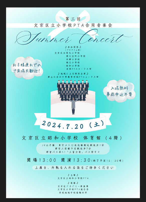 文京区立小学校PTA合同音楽会 本日7/20、13:30より昭和小学校体育館にて5校(明化小、関口台町小、本郷小、誠之小、昭和小)合同での音楽会が開催されます。 入場無料、お子様連れ🆗です。 都立小石川中等教育学校PTAのコーラス部もゲスト参加予定。