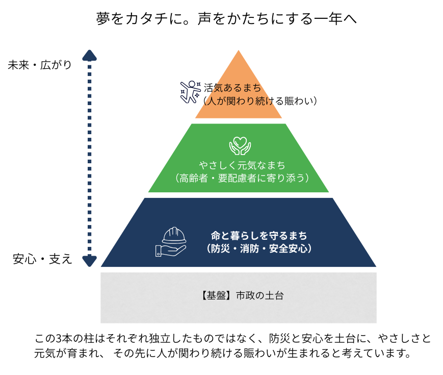 防災と安心を土台に、やさしさと元気が循環し、人が関わり続ける賑わいを育てる。この3つの柱と、それを支える基盤を大切に、現場と行政をつなぐ議員として、清瀬の「今」と「これから」に責任を持つ一年にしていきます。