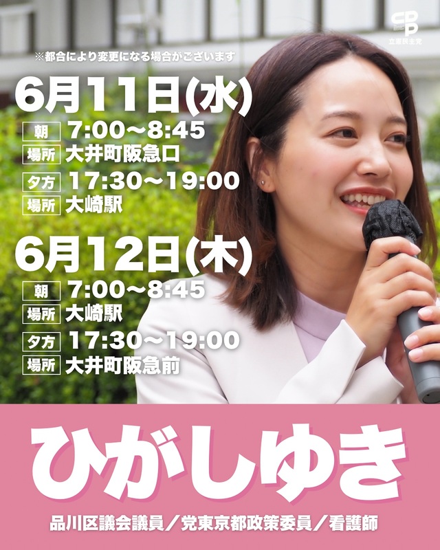 ホーム>政党・政治家>ひがし ゆき (ヒガシ ユキ)>\街宣スケジュールのお知らせ📢/今週も品川区内をまわり、皆さんに想いをお届けします!ほんの少し...