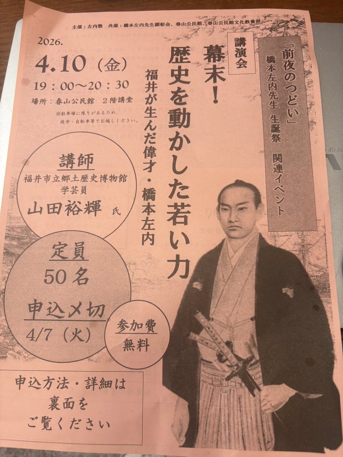 橋本左内先生の生誕前夜祭にて、山田裕輝氏の講演を拝聴しました。