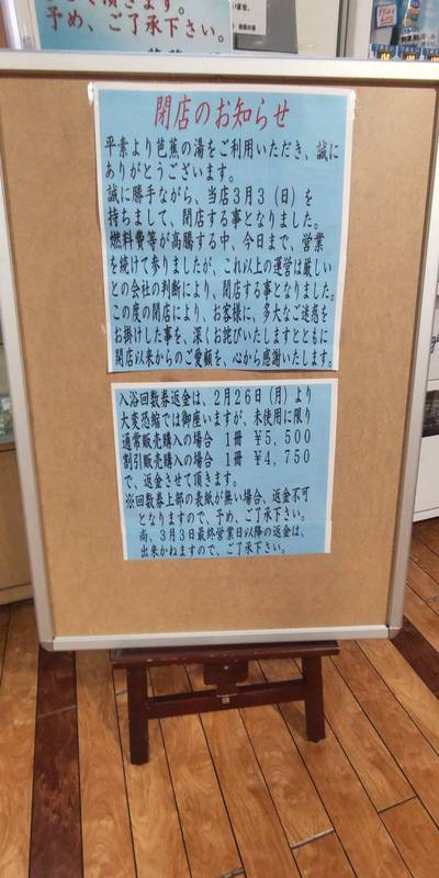 芭蕉の湯閉店2時間前に、最後の券で入浴してきました。中は人がいっぱいで、特に露天風は入れる場所が無いほどでした。まるで廃線になるローカル線最終列車のよう。普段からこのくらい人が、来ればつぶれる事は無かったかもしれませんね。お疲れ様でした。