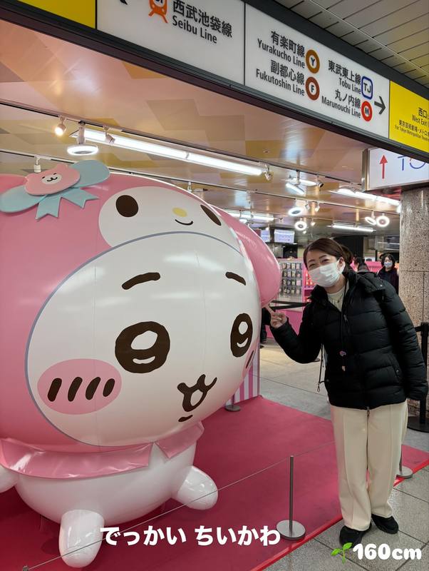 池袋駅に鎮座する でっかいちいかわ マイメロなどサンリオコラボ どのくらい大きいのか… 写真のとおり、これくらいでっかいです。私、160cm