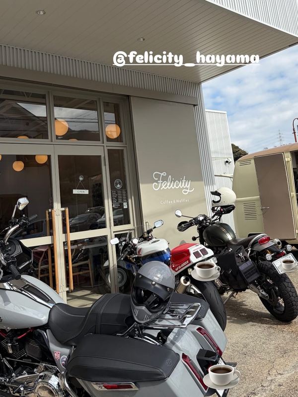閉店したバイクショップ「幸福商會」をリノベーションした店舗とのことで、お客さまのバイクがお出迎えしてくれるライダーズカフェ。