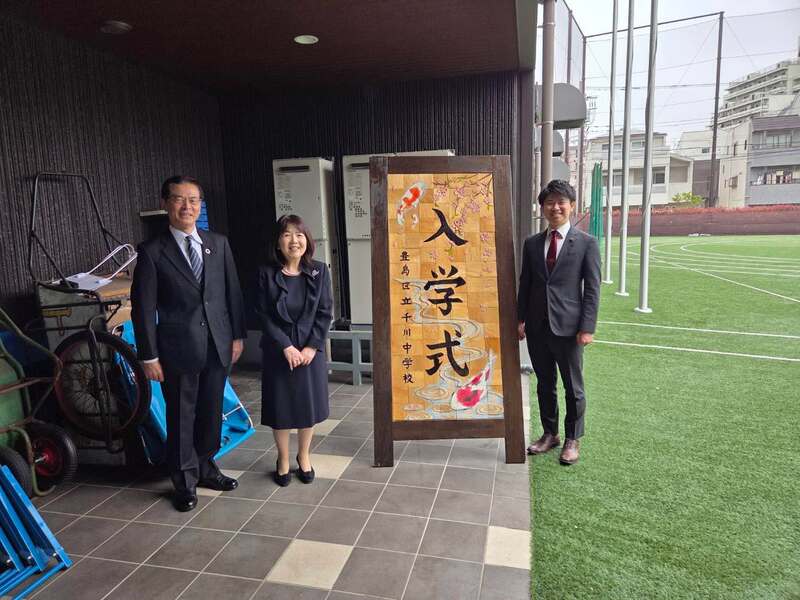 本日は千川中学校の入学式に来賓として出席。新入生の皆さんご入学おめでとうございます! 式後には大先輩の辻薫区議、新たに着任された校長先生と一緒に写真撮影させていただきました。