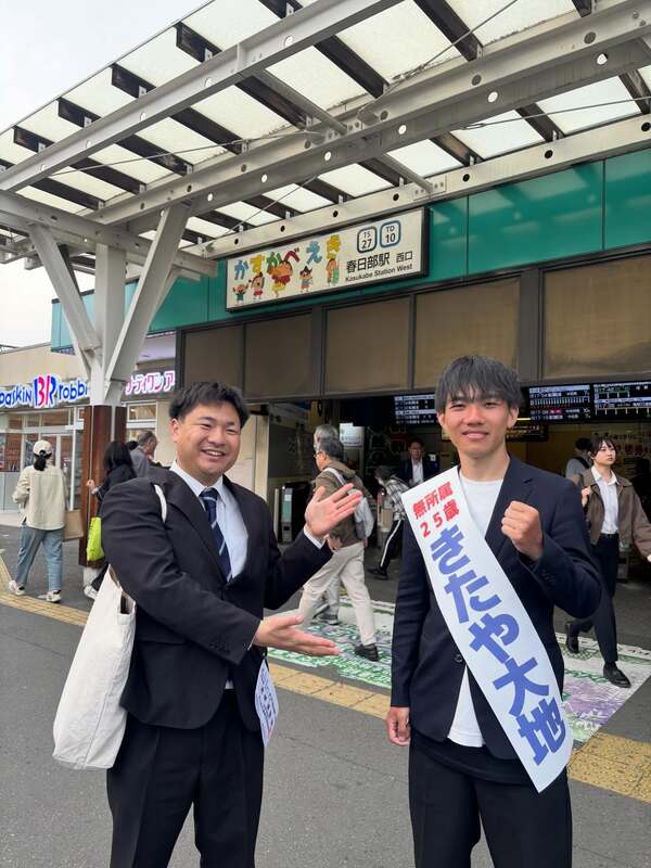 埼玉県春日部市では市議会議員選挙🗳️が行われています。25歳無所属で立候補している「きたや大地」候補の応援に伺いました!