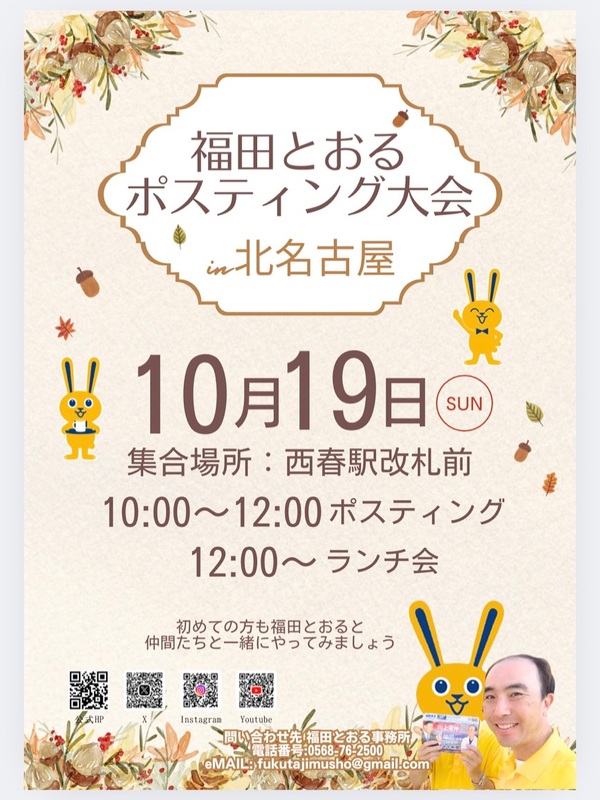 ホーム>政党・政治家>福田 とおる (フクタ トオル)>【ポスティング大会、ランチ会】北名古屋市にてポスティング大会、ランチ会を行います!私も参加しま...