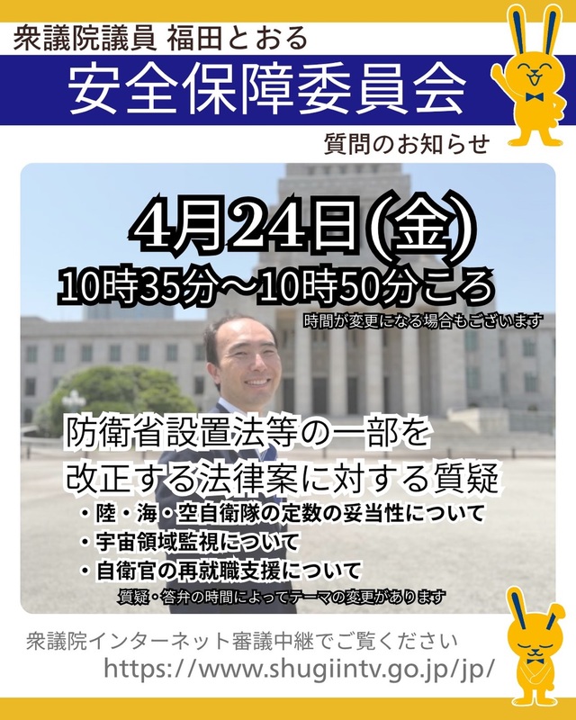 ホーム>政党・政治家>福田 とおる (フクタ トオル)>明日も安全保障委員会にて質疑させていただきます。