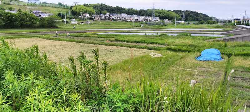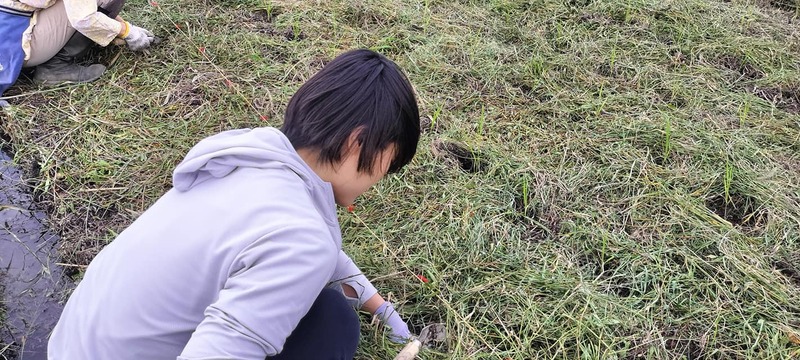 想像していた田植えとは違い、鎌で雑草を分けて小さな穴を掘り、そこに1つ1つ稲を植えて行きます。(今日はジャポニカの香り米とうるちの黒米を植えました)
