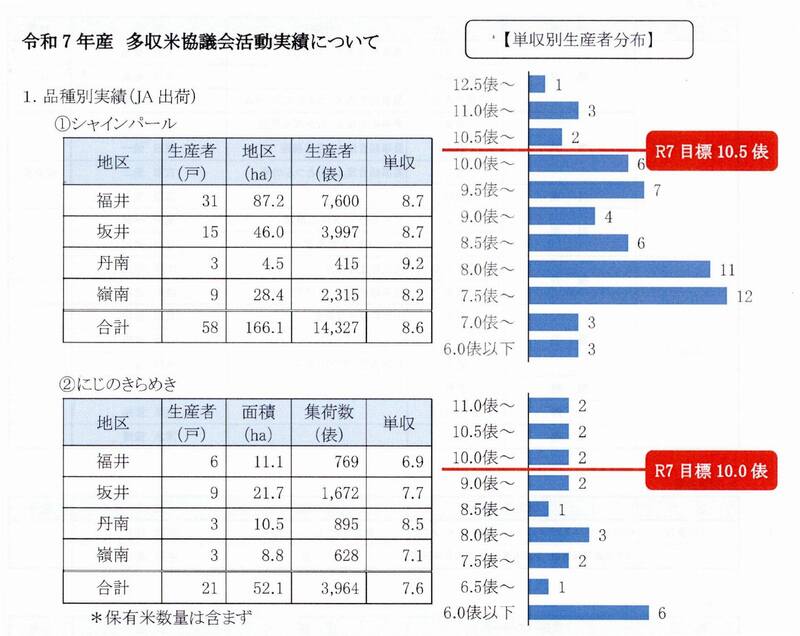 まず、シャインパールについては、県が令和4年に品種登録、令和6年からフレコン出荷に対応して本格的に生産が開始された新品種であり、穂が長く粒数が多いことから多収が期待される品種です。資料によりますと、令和7年産においては、生産者58戸、作付面積166.1ha、集荷数14,327俵、平均単収8.6俵となっており、生産規模は着実に拡大しています。