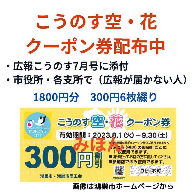ホーム>政党・政治家>中西 こうじろう (ナカニシ コウジロウ)>【鴻巣市】こうのす空・花クーポン券配布中!市内飲食店や小売店等で利用できる「こうのす空・花クー...
