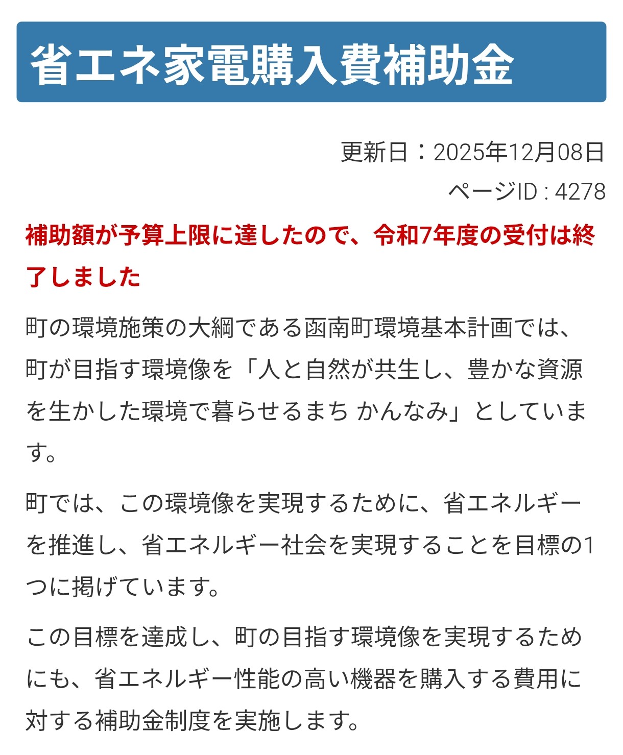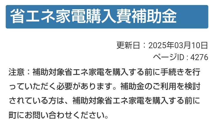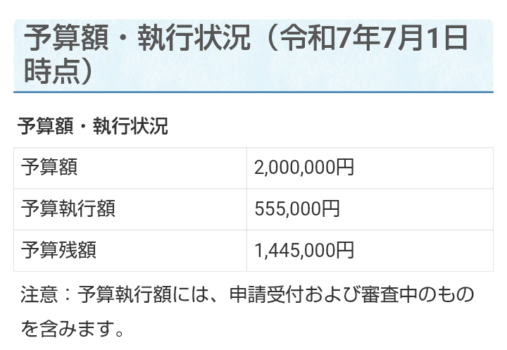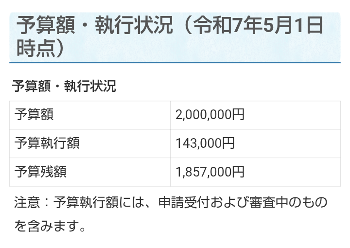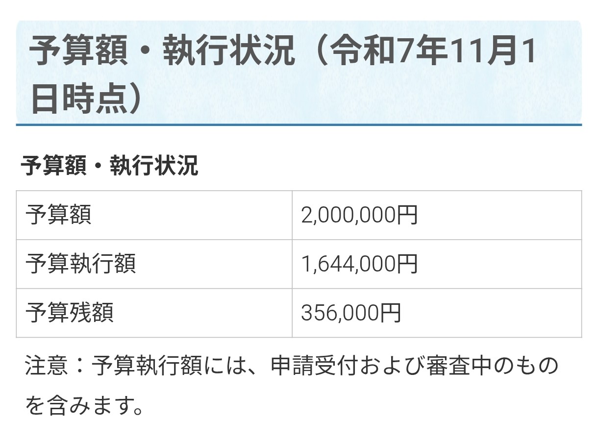 補助額が予算上限に達したので、令和7年度の受付は終了しました、と情報が公表された。