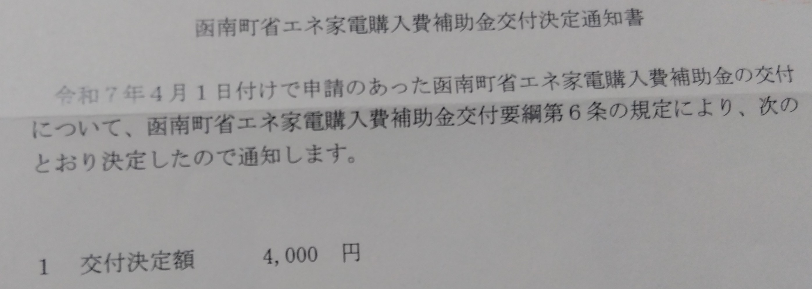 4/4交付決定( 通知書 郵送到着4/10)冷蔵庫購入契約 4/10