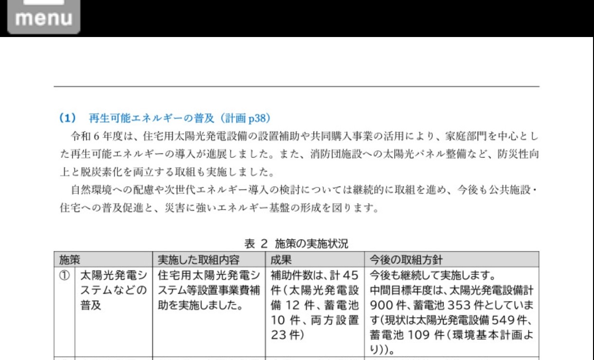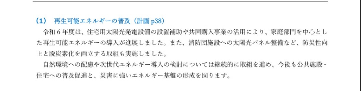 計画の38ページに記述された再生エネルギーの普及についての報告部分だと、ページ数が掲載されて、やっと、わかりやすい報告書になった。