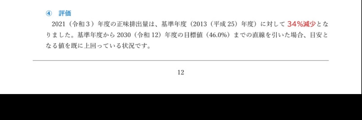 12ページ 函南町 実は温室効果ガス排出量 2013年と比較し、34%減少している。この実績は、強調するべき。
