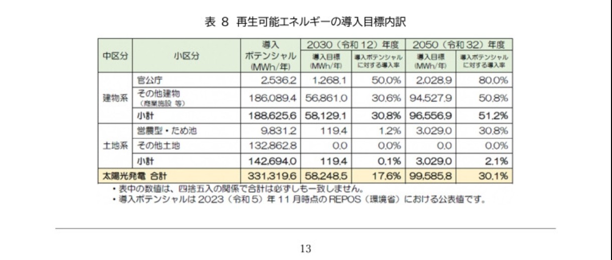 13ページには、再生可能エネルギーの導入目標内訳があり、計画の中にも、ため池への太陽光発電設備の導入が将来検討されている。