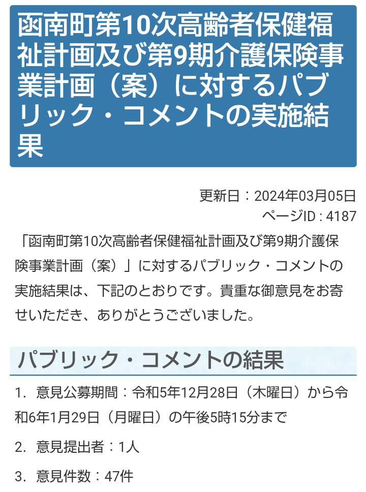 函南町では、高齢者保健福祉計画、介護保険計画の改定時期にあり、パブリックコメントを実施していた、結果が公表されたが1人で47件、意見提出。22件意見反映された。その他、答えるなの指示が出ている部分を含めて30件が実質、意見反映されている。回答を控えると言いながら、議事録等は、しっかりと公開されてきているので、環境審議会と同様に根底から会議のあり方がひっくり返る結果となった。