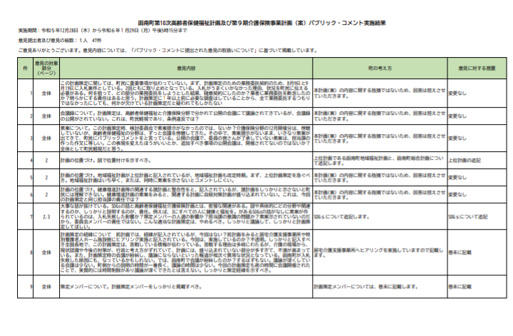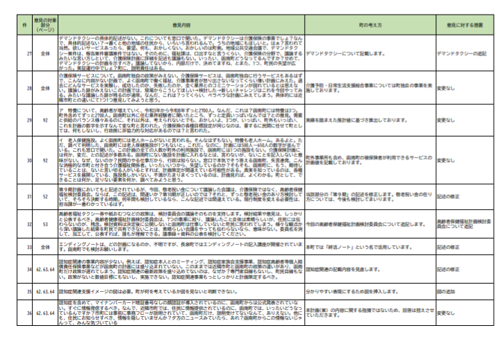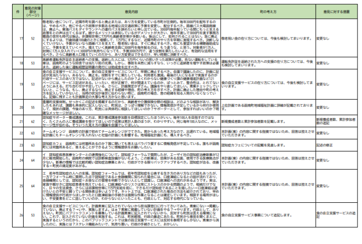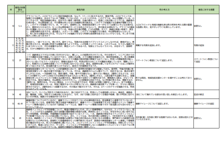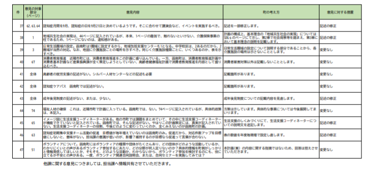 どんな事情があっても、こんなに1人の意見が、あれこれ、採用されるのは、異常。全く議論されずに、素案ができていること、実は、会議のメンバーと町民が同じタイミングで、素案を知るという事情を早い段階から予想していたため、先回りをしていただけで、本来は、会議メンバーの議論があり、素案了承後にパブリックコメントを実施しないと、こうなる。